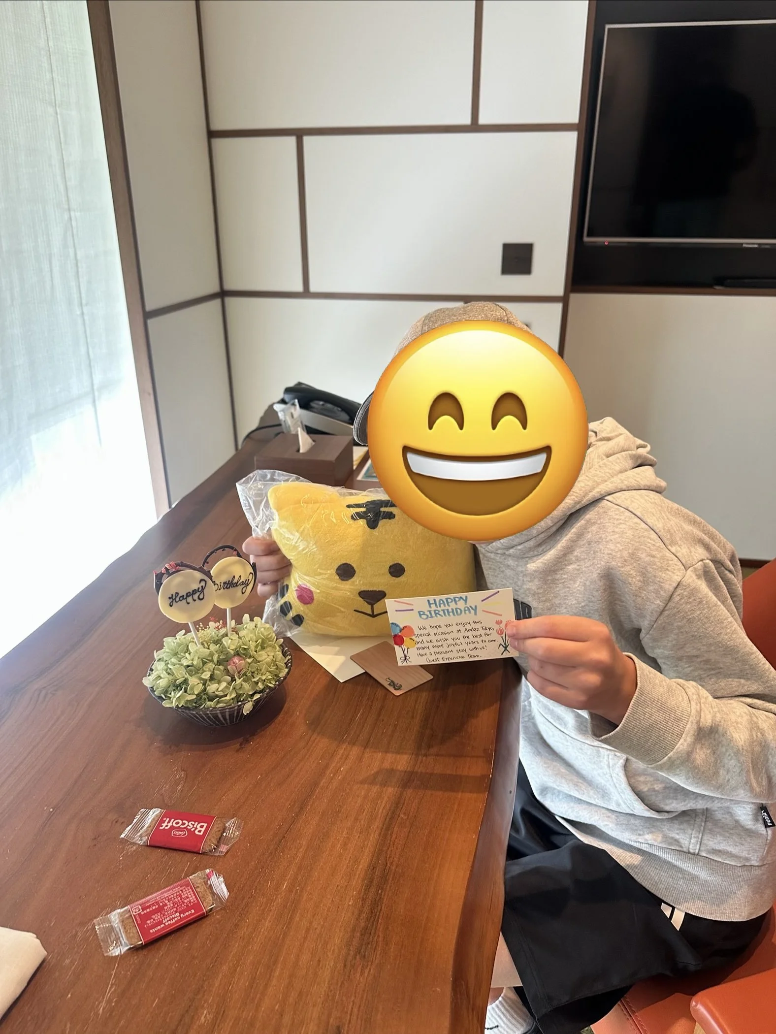The rooms are large by Tokyo standards and most rooms can accommodate up to three people. We had three twin beds. The hotel had gifts for the kids-little cute pillows- and a treat in the room for my 11 year olds birthday. They provide fun traditional locally-made Japanese treats each day, which was a unique touch. Nothing wins me over more than treats in the room- I was completely sold from that minute on. Every hotel in Japan includes Japanese pajamas (yukata) in the room. They even had them in the right sizes for my 11 and 4 year olds, they were so cute.