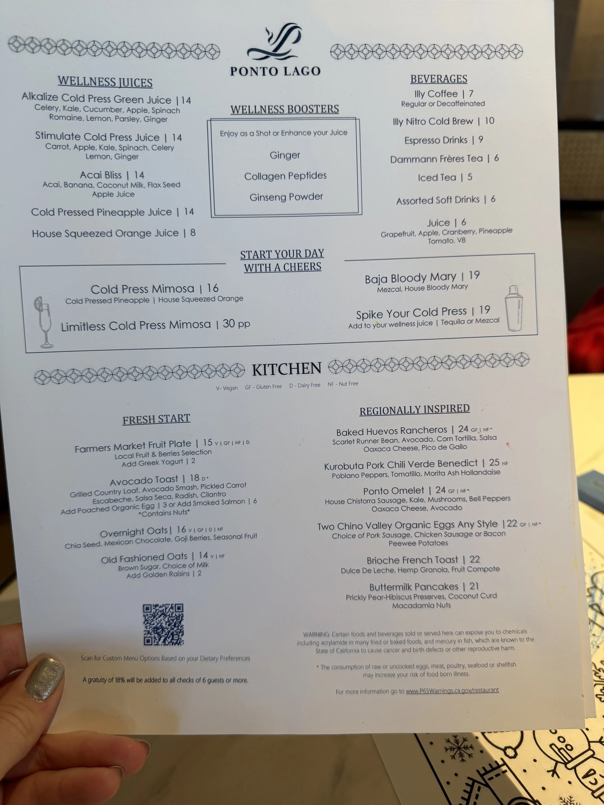Ponto Lago is the main restaurant, overlooking the grounds. This is where Globalist breakfast is served — one drink or smoothie plus a menu item per person, or the buffet on weekends. Specialty drinks run around $15, so the Globalist benefit is a real value. Food is California coastal, Baja-inspired, and very good. Kids' meal options are more basic.
